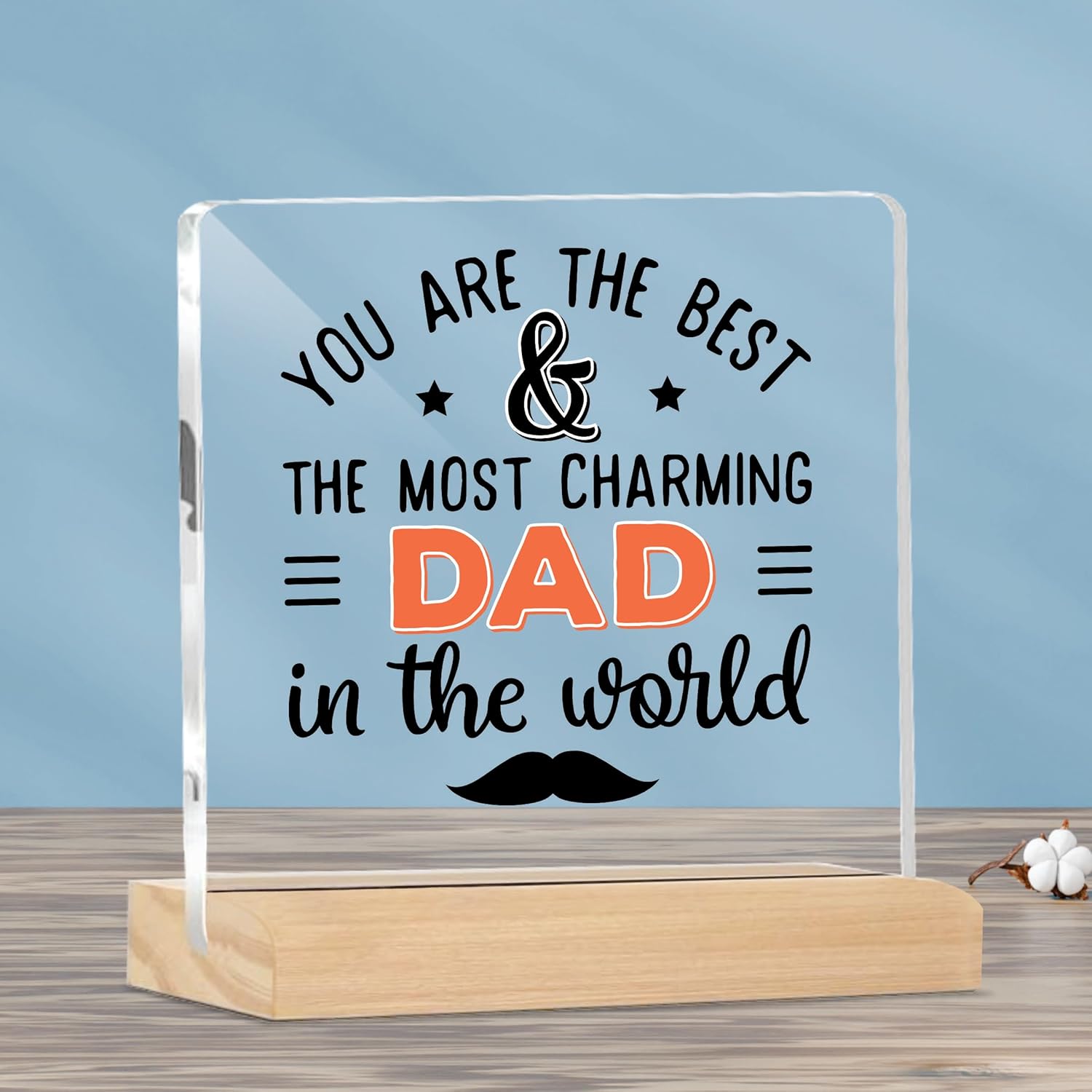 Giftplease Acrylic Sign Best Dad Plaque: A 4 x 4-inch plaque that celebrates the greatness of dads. Made of durable acrylic and mounted on a wooden stand, this plaque makes an excellent gift for Father?s Day or any occasion. Its simple design and heartfelt message make it a great addition to your dad?s office or home decor.