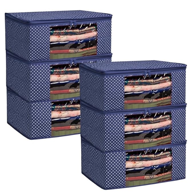 These quilted saree covers come in navy blue and feature a three-layer foldable design with zip closure and transparent windows. Ideal for storing sarees, lehengas, or dresses safely while keeping them visible.